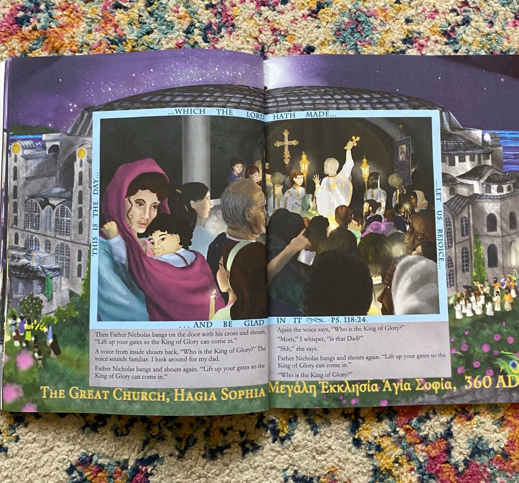 This book does an excellent job of viewing the Paschal Midnight Service from the eyes of a young girl (I would guess 8-10 years old), her family, and friends. What I love about this book is that on each page in the background is a different Orthodox Church from around the world. RJ Hughes takes us across the globe on that Holiest of nights when we as Orthodox celebrate the Resurrection of Christ.